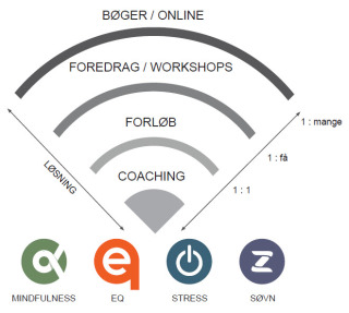 Vi oplever, at disse fire områder er væsentlige at mestre for at opnå en høj grad af trivsel og mental ydeevne. For hvert område har vi en vifte af tilbud, der retter sig mod den 1. enkelte medarbejder via coaching, 2. flere medarbejdere, som deltager på vores forløb og foredrag, eller til en 3. større gruppe, der anvender vores online værktøjer eller bøger. Vi skræddersyr løsninger baseret på virksomhedens specifikke behov og udfordringer. |